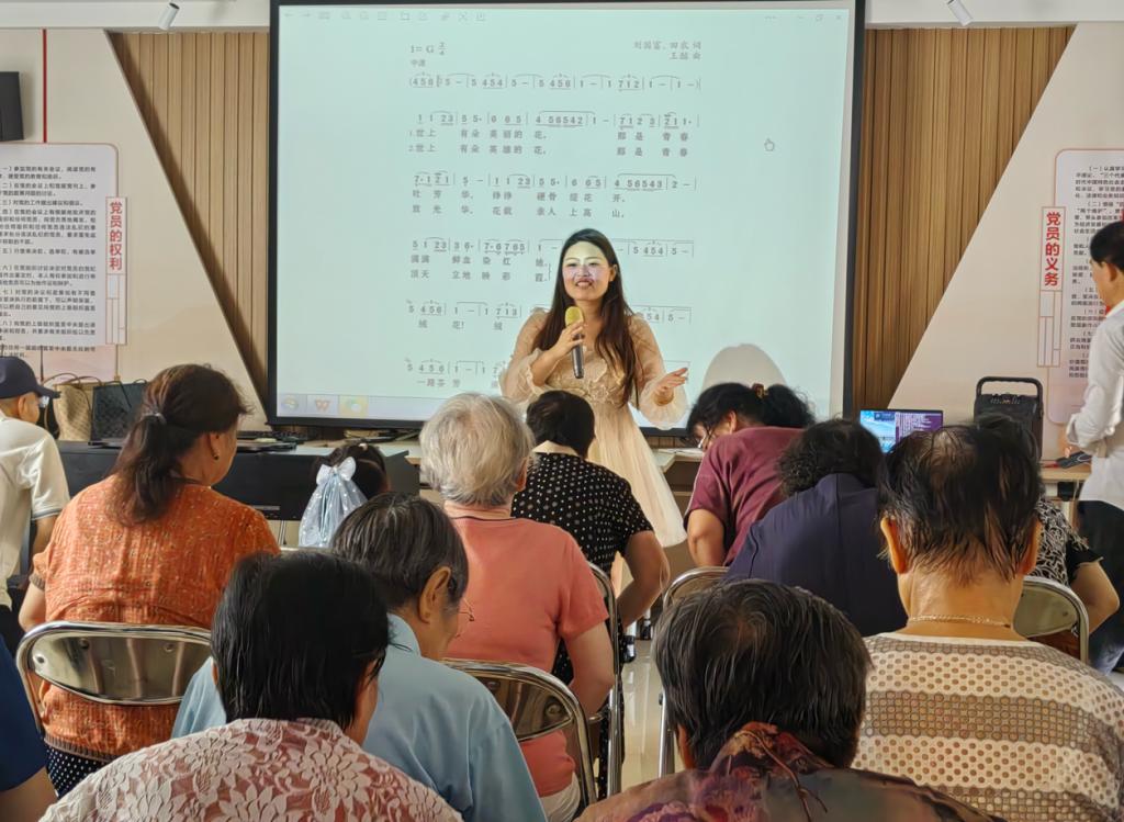 实践团队以音乐为纽带,文老师作为声乐教师教授红歌。志愿者与老人们共同学习经典红歌、钢琴弹唱《绒花》引发全场共鸣,现场气氛热烈,老人学习认真。