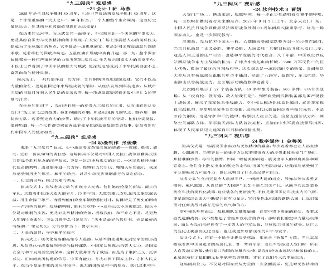 观看结束后各班进行了讨论分享活动,并积极撰写观看感悟。员工王文杰感慨道,“此次阅兵活动让我感受到我们的胜利来之不易,只有国家富强安定人民才能安居乐业,我们要珍惜现在的美好时代,不断奋斗和努力,为祖国繁荣富强添砖加瓦。”员工干部杨俊乐激动地说:“从阅兵式恢弘的场面中,我深切感受到团结所带来的震撼力量。所有受阅人员步调一致、默契配合,呈现出整齐划一、气势如虹的阵容。这种高度的协同精神和集体荣誉感,也深刻启示我们:在生活中应当注重团结协作,凝聚集体智慧,共同朝着既定的目标不懈奋斗。”