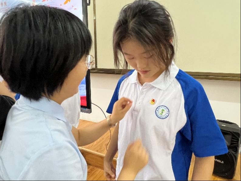 仪式在激昂的国歌声中正式开始。主持人宣读新团员名单后,各位领导、老师为新团员郑重颁发团徽,一枚枚闪耀的团徽承载着责任与使命。